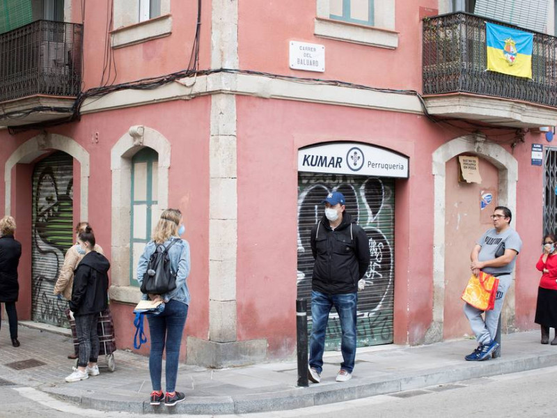 Varios vecinos esperan la cola para entrar en una tienda en el barrio de la Barceloneta, en Barcelona. EFE/Marta Pérez