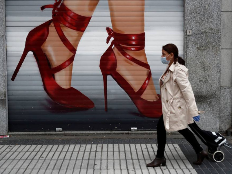 Una mujer que va a hacer la compra pasa ante el cierre de un negocio cerrado en el que hay pintado un grafiti, en Madrid. EFE/Mariscal/Archivo